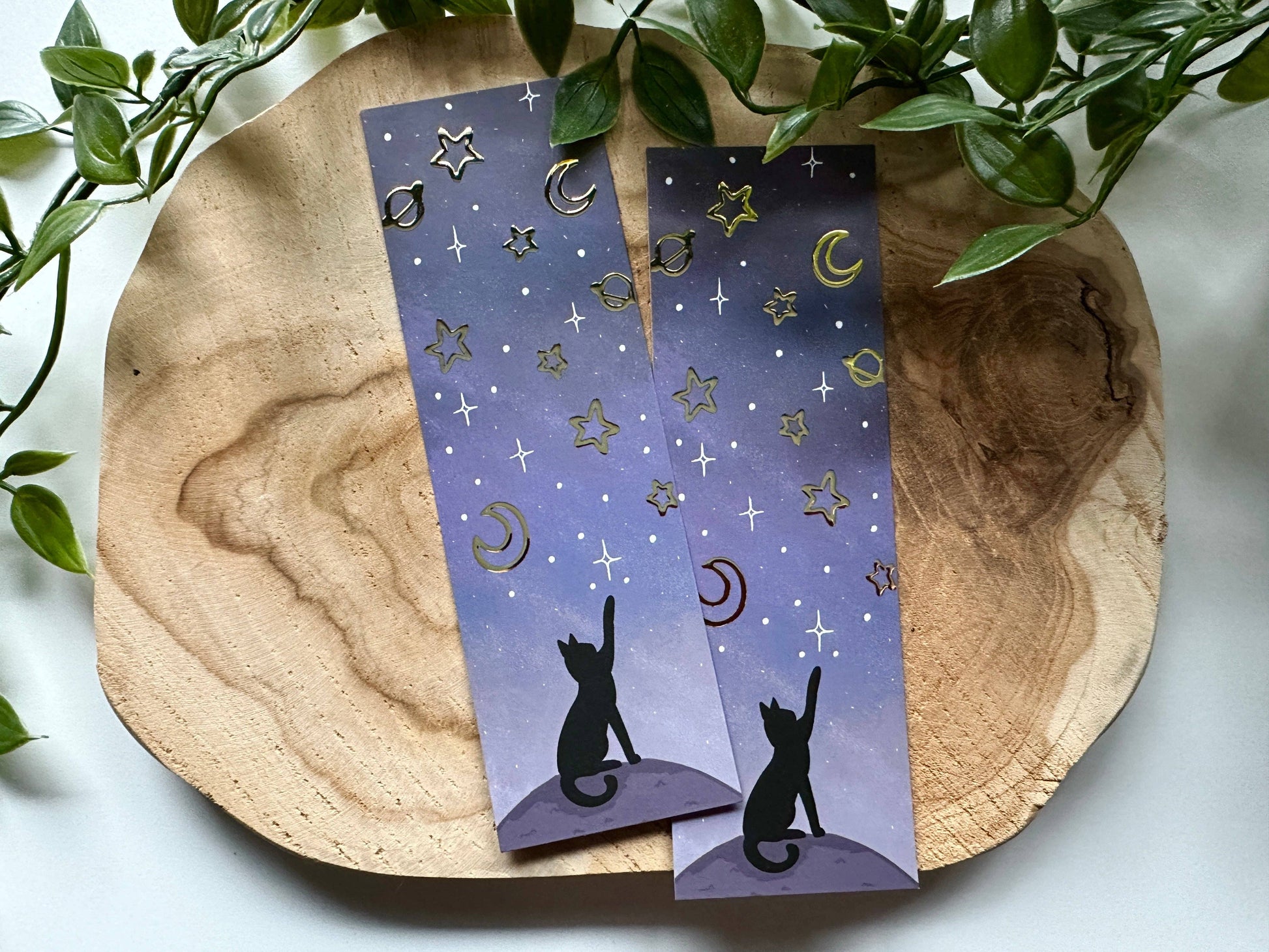 Ihastuttava kirjanmerkki kirjojen ja kissojen ystäville. Kirjanmerkin etupuolen yksityiskohdat ovat kauniisti kullattuja ja tekevät kirjanmerkistä täten entistä upeamman. Kirjanmerkin kaunis värimaailma jatkuu sen molemmin puolin.